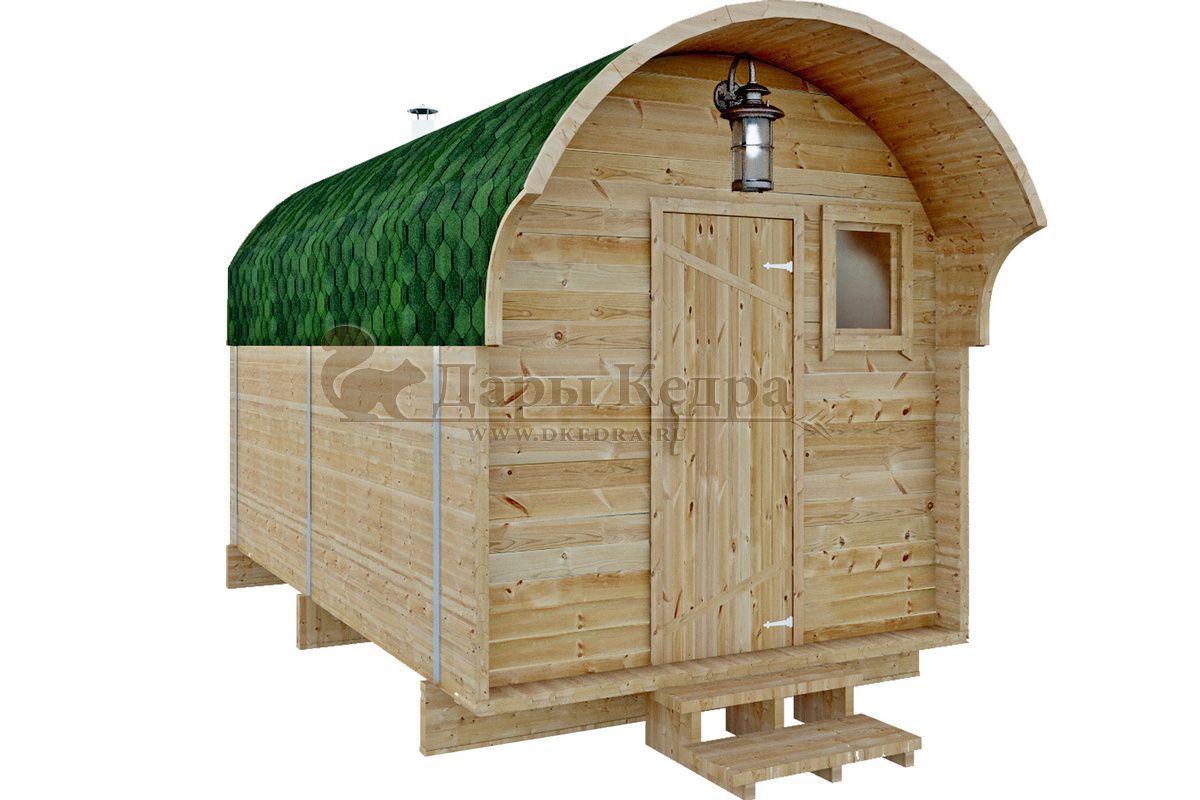 Это более просторная модель за счет увеличенной высоты потолков и ровного пола. В такой модели раздевалка совмещена с моечной. Тут установлен душевой поддон, вешалка, полочка и лавочка из кедра. В парильном отделении по обе стороны расположены двухуровневые открытые полки, печь находится между ними у дальней стены. Время растопки такой бани не превышает 30 минут. По вашему желанию баню-бочку можно укомплектовать козырьком, верандой и печью с внешней загрузкой, благодаря которой весь мусор во время топки остается на улице. Баня-бочка буханка не требует полноценный фундамент, поэтому при необходимости ее можно перенести в другое место.