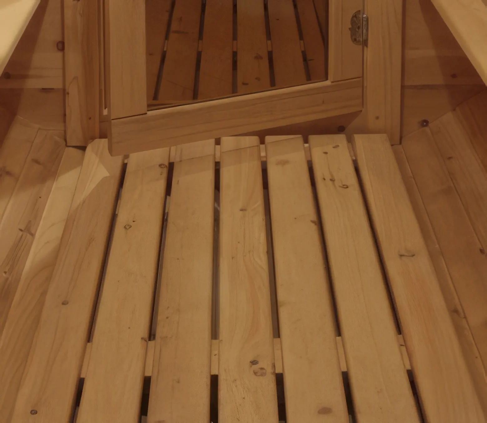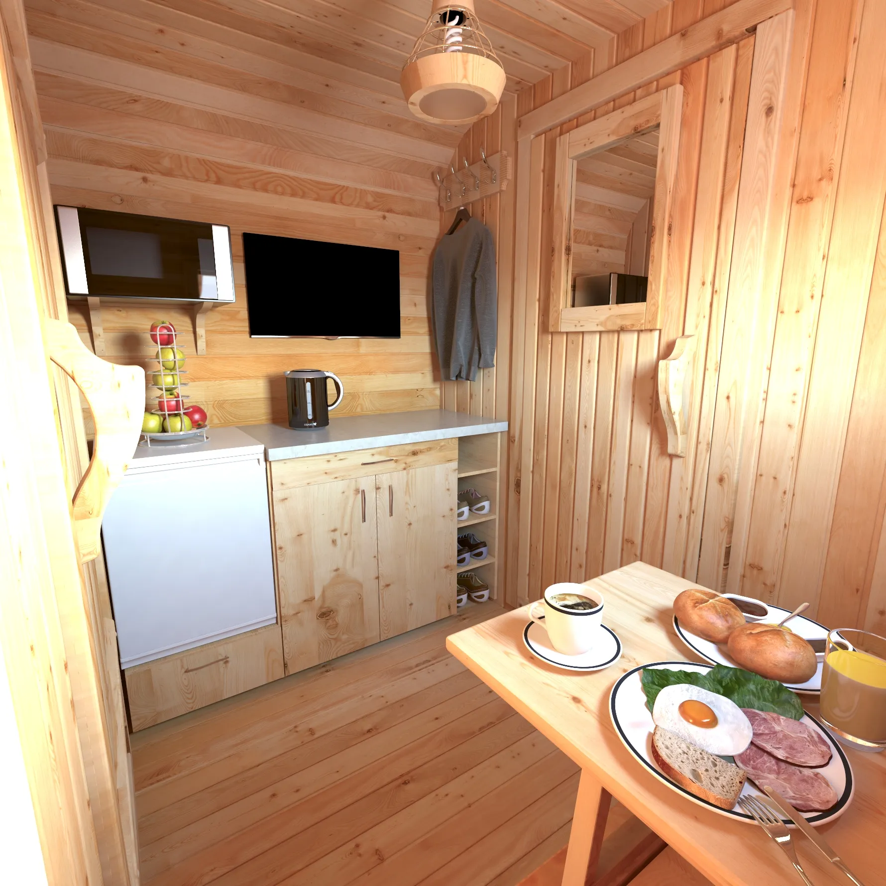 Баня-буханка более просторная за счет увеличенной высоты потолков и ровного пола. Козырек не только украшает баню, но и защищает оставленную обувь от дождя. Лавочки из кедра находятся по всей длине бани-бочки с обеих сторон. Печь расположена в парилке около дальней стены. Время растопки такой бани не превышает 30 минут. В зависимости от выбранного размера баня-бочка буханка с козырьком имеет следующую комплектацию: