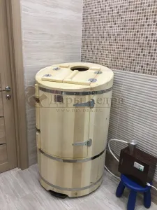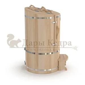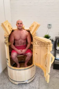 Круглая фитобочка из кедра - это мини парная, которую можно использовать не только в спа-салонах, но и дома. Такая модель наиболее компактна и мобильна. Толщина стенок составляет 40-45 мм, что позволяет увеличить срок службы изделия. Фитобочка оборудована откидными створками, дверцей и отверстием для головы. Верхний скос изделия делает положение головы более комфортным и улучшает обзор. Во время парения человек сидит внутри кедровой бочки, а голова находится снаружи. Благодаря этому исключается возможность перегрева. Подлокотники из кедра, встроенные ручки на створках и двери делают эксплуатацию более удобной.