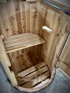 Приступок с двумя ступенями, позволит комфортно заходить в кедровую бочку и выходить из неё.