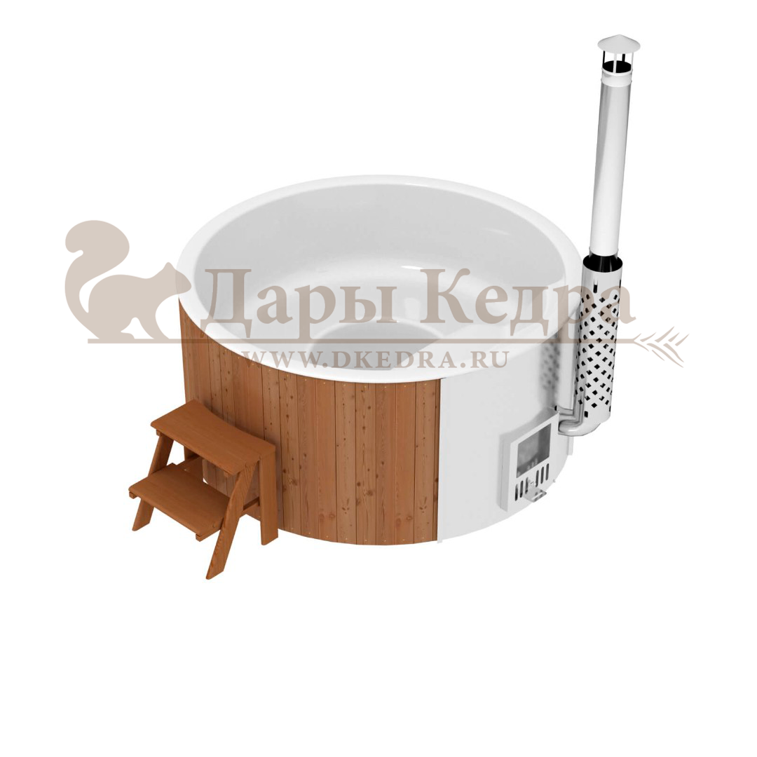 • Фурако круглая из кедра с литой термопластиковой вставкой с внешней печью Это уличная подогреваемая купель с круглой внутренней чашей из термопластика, которая имеет цельную форму вместе с сиденьями и дном. Для удобства пользования купель фурако оборудована приставной лестницей. Подогрев воды осуществляется за счет внешней печи с дымоходом. Термопластик устойчив к воздействию температур, облегчает уход за фурако и увеличивает срок ее службы. Парение на свежем воздухе – это отличный способ укрепить здоровье и поддержать организм в тонусе.