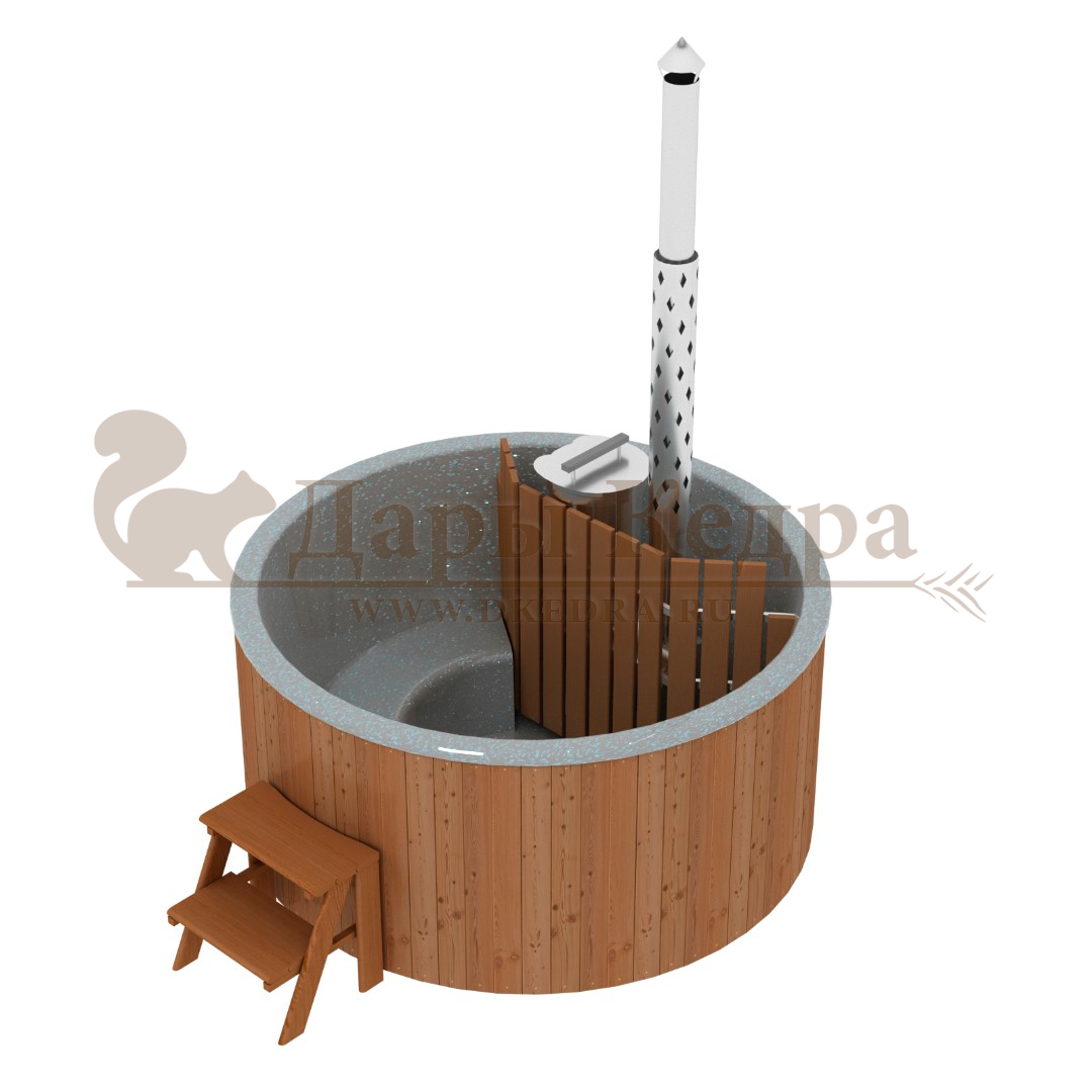 • Финская круглая композитная купель с подогревом (с печкой) «Премиум 220 35 квт» Это уличная подогреваемая купель с круглой внутренней чашей, которая изготовлена из современного прочного и термоустойчивого материала (композита). Форма чаши обеспечивает комфортную посадку во время принятия процедур. Для удобства пользования купель фурако оборудована приставной лестницей. Нагрев воды осуществляется за счет встроенной печи, которая находится внутри купели за перегородкой из кедра. В комплектацию этой модели входит савок с длинной ручкой, который позволяет извлекать угли после эксплуатации изделия. Композитная вставка придает купели красивый внешний вид, продлевает срок службы и облегчает уход за изделием. Парение на свежем воздухе – это отличный способ укрепить здоровье и поддержать организм в тонусе.