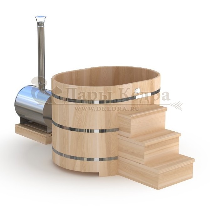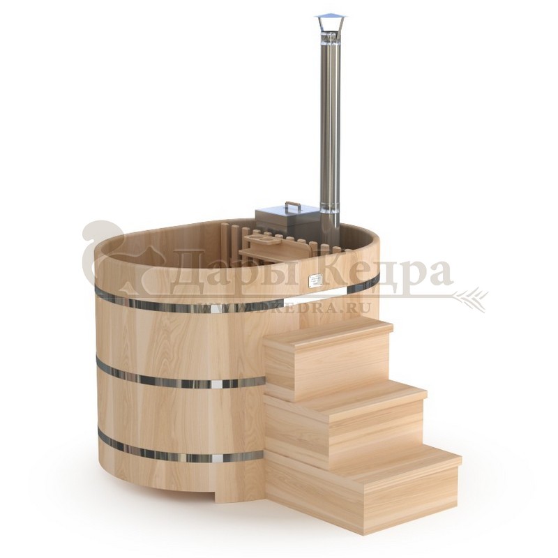 • Фурако овальная из кедра со встроенной печью Это уличная баня, которой можно пользоваться круглый год. Купель представляет собой овальную емкость для воды, внутри которой располагаются сиденья из кедра. Нагрев воды происходит за счет встроенной печи, которая находится внутри купели за перегородкой. Рекомендуем приобрести термокрышку и весло для перемешивания воды для ускорения нагрева. Для удобства пользования японская баня фурако оборудована внешней и внутренней лестницей из кедра. В комплектацию этой модели входит совок с длинной ручкой, который позволяет извлекать угли и золу после эксплуатации изделия. Целебная древесина кедра богата фитонцидами и эфирными маслами, которые активируются при нагревании. Таким образом, во время процедур парения организм насыщается полезными веществами.
