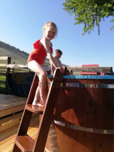 Приставная лестница с тремя ступенями и закруглёнными перилами обеспечит максимальный комфорт при входе и выходе из купели.