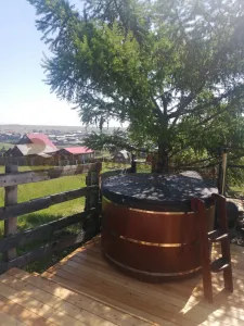 Это уличная подогреваемая купель с круглой внутренней чашей из термопластика. Для удобства пользования купель оборудована лавочками, приставной и внутренней лестницей. Подогрев воды осуществляется за счет внешней печи с дымоходом. Термопластик устойчив к воздействию температур, облегчает уход за фурако и увеличивает срок ее службы.
